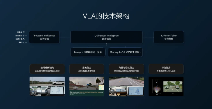 VLA 的全称是 Vision-Language-Action,是视觉-语言-动作模型。在 VLA 模型中,V 承担着空间感知的职责,通过摄像头、导航等多种输入,构建出对周围环境的理解;L 则把这种感知翻译成清晰的语言;A 指的是根据对场景的编码,生成行为策略,也就是模型该怎么开车。