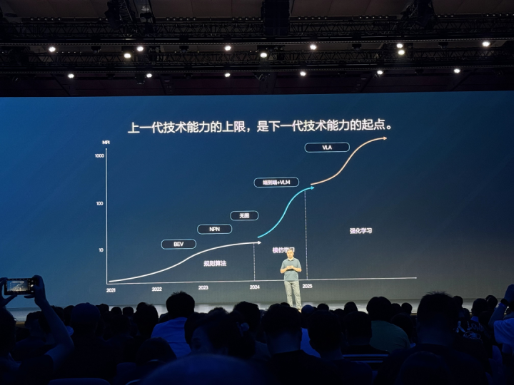 郎咸朋提出了一个观点:「我们认为上一代技术能力的上限,是下一代技术能力的起点。」这个观点来自理想进行辅助驾驶架构迭代的实践经验。从 2021 年做到 2024 年,这个时期属于规则时代,理想把(高速 + 城市)全场景的 MPI(平均接管里程)做到了大约 10 公里,这也是端到端起步阶段的数据,现在端到端 + VLM 方案的 MPI 则来到了 200 公里左右。